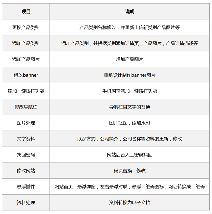 网站维护项目一览表